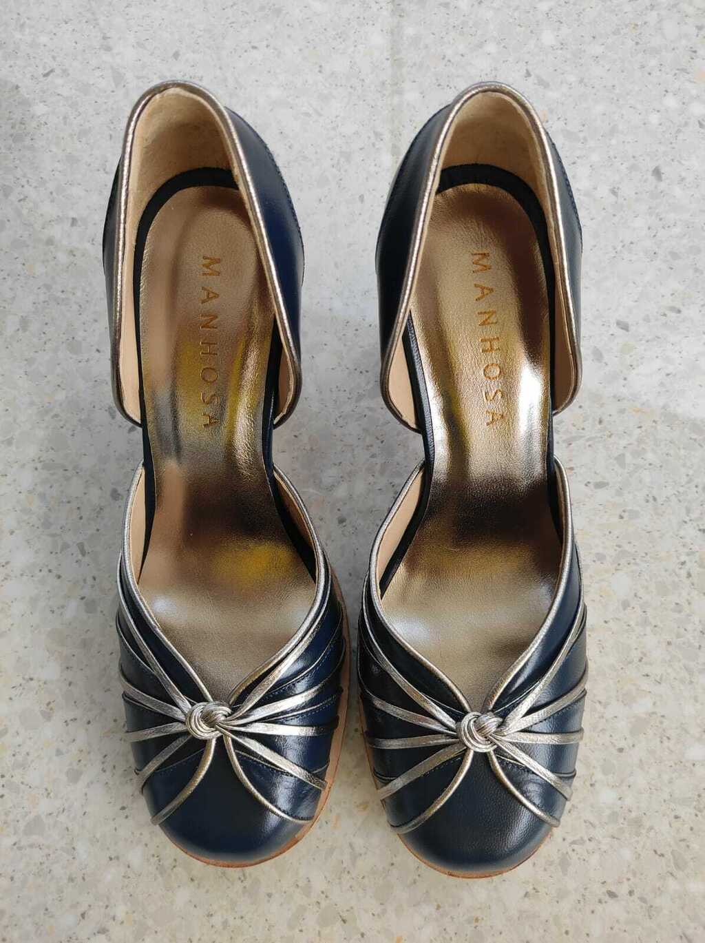 Pelica Marinho com prata velho e salto fachetado de sola.